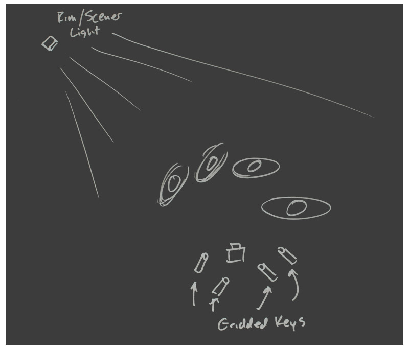 In the Usual Suspects -style photo above (more here) there was a 2-stop down umbrella right at the camera, acting as an on-axis fill. Those slaved, low-powered accent lights were fired by the umbrella. And if they weren’t, one of the many other accent lights took care of the problem for us.